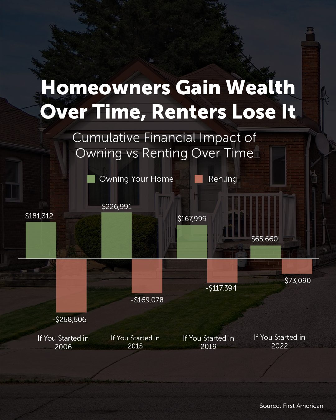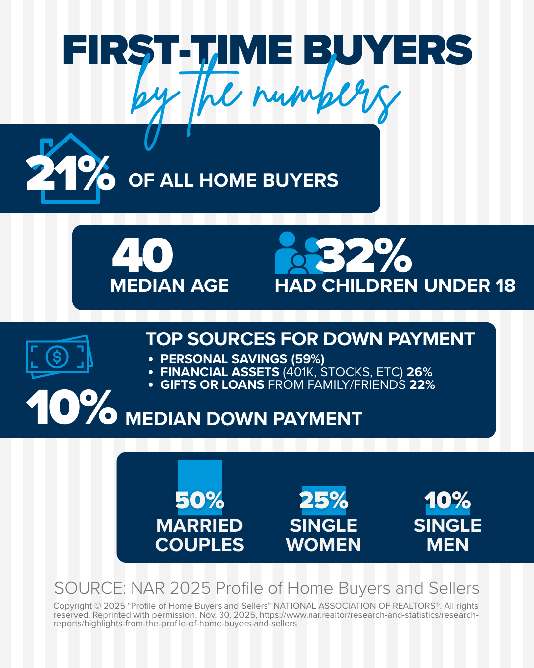 Speaking of down payments, I see buyers diversify by utilizing or borrowing against stocks and/or 401K funds, and the NAR survey revealed 26% of first-time buyers used these types of funds to achieve their homeownership goals. It is also not uncommon for some fortunate buyers to receive gift funds in order to achieve homeownership, and the NAR survey showed 22% of first-time buyers were able to utilize this route. With the big picture of building household wealth in mind and the fact that everyone needs a roof over their head, having your home be a part of your investment portfolio makes sense.