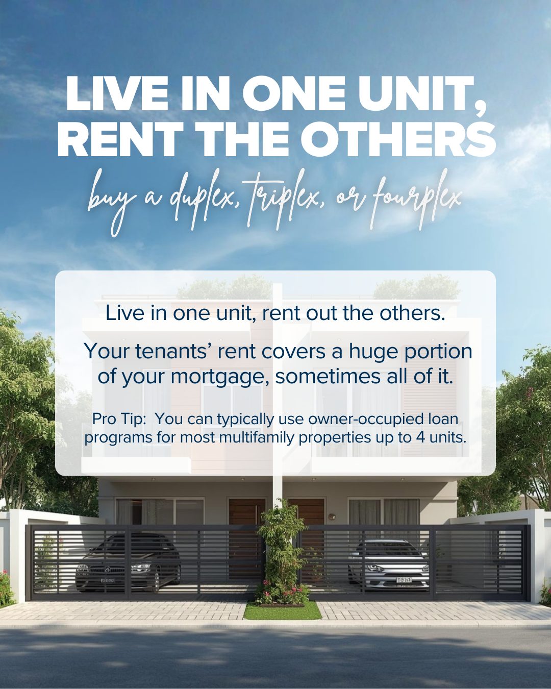 Shop 2–4 unit properties (duplex/triplex/fourplex). When you buy a multi-unit property and live in one unit, you get to enjoy owner-occupied financing rates. You can live in one of the units and rent the other(s) to help offset your mortgage payment. This could even allow for a lower down payment. It is important to calculate your potential monthly payment and assess rental rates in the area to figure out how having a renter(s) would help offset your monthly overhead. Also, consider if you had a vacancy, could you still make it work while you tried to fill it.