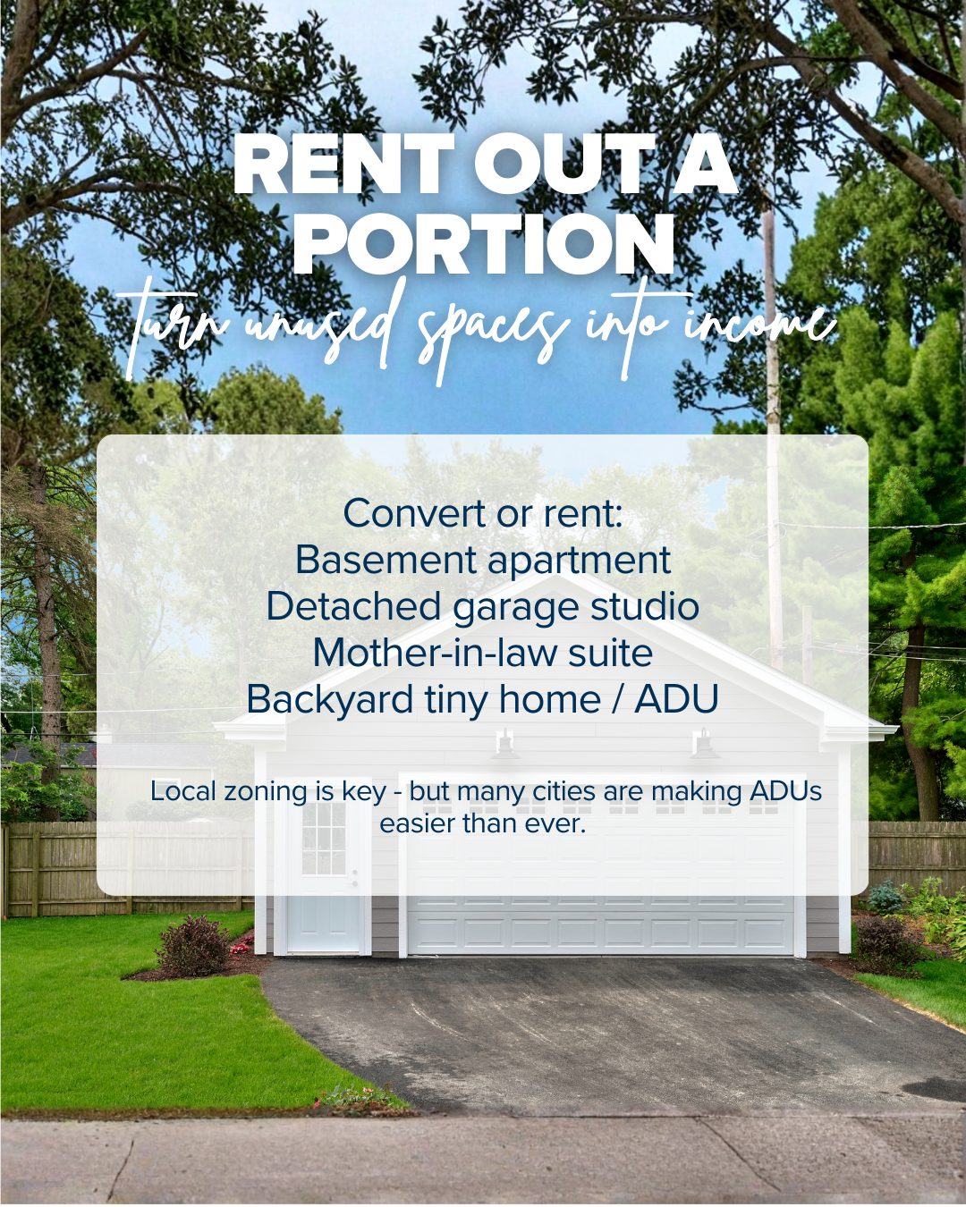 You could buy a home with an existing ADU (detached cottage, basement unit, garage studio). Or buy an “ADU-ready”: daylight basement + exterior door, or garage with alley access. Start by renting a room or partial suite now, then add/finish an ADU later when cash allows.